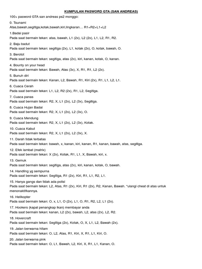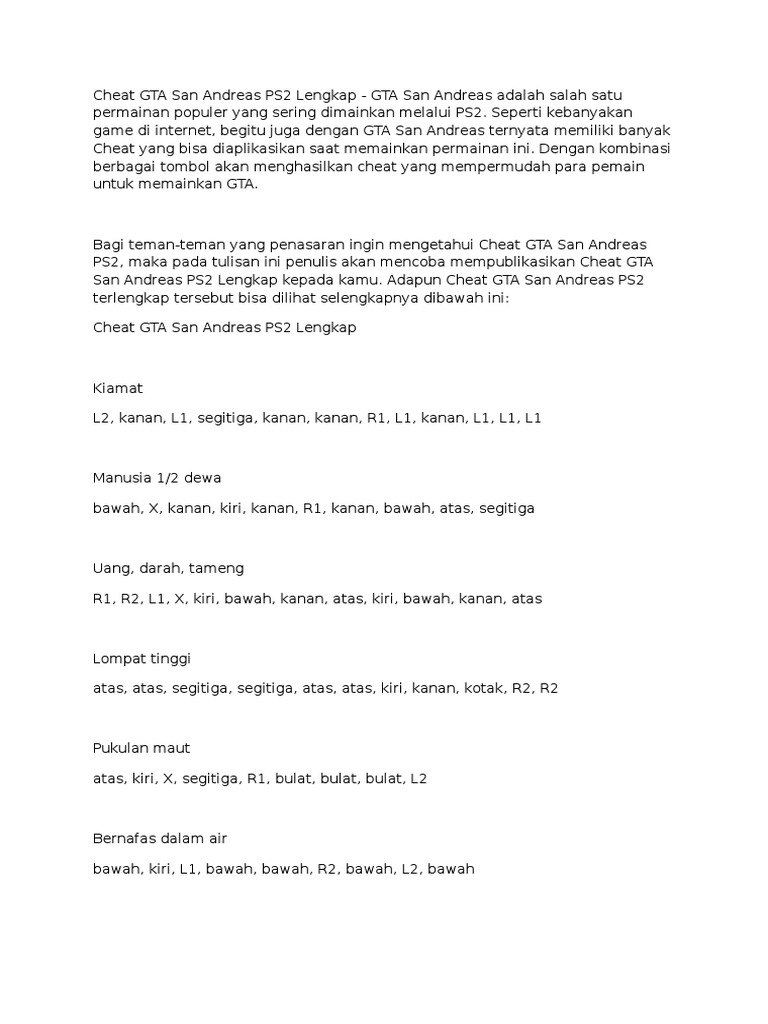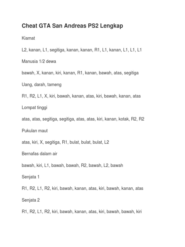 Manual vga save driver avatar game cheat ps2 gta san andreas indonesia kiamat san andreas bus location ps2 bahasa indonesia lengkap tsunami bounce. Dengan kombinasi berbagai tombol akan menghasilkan cheat yang mempermudah para pemain untuk memainkan gta. When a cheat code is successfully entered, a cheat activated message will appear on the upper left corner of the screen to confirm the cheat has been entered. Karena banyak dan susahnya mission yang harus diselesaikan,kebanyakan para gamers menggunakan cara curang yang biasanya dinamanakan cheat. Jalantikus adalah website teknologi berbahasa indonesia yang menyajikan informasi gadget, game android, ios, film, anime dan informasi teknologi lainnya.